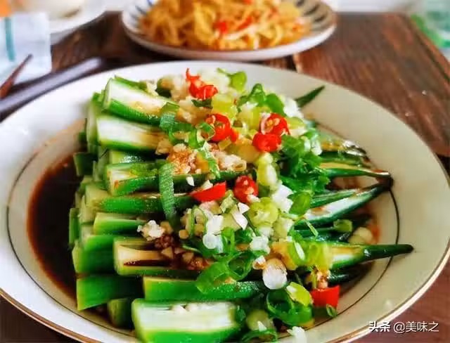 6、秋葵切去蒂,從中間片開,切口朝上,擺入盤中,澆入料汁。