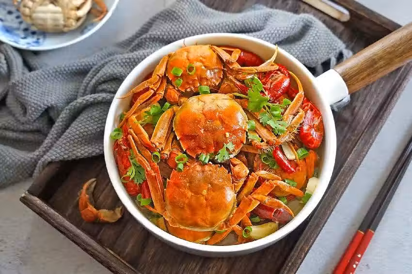 【食材】螃蟹8隻、小龍蝦數個、生薑5片、蔥4棵、紅辣椒5個、蒜頭6粒