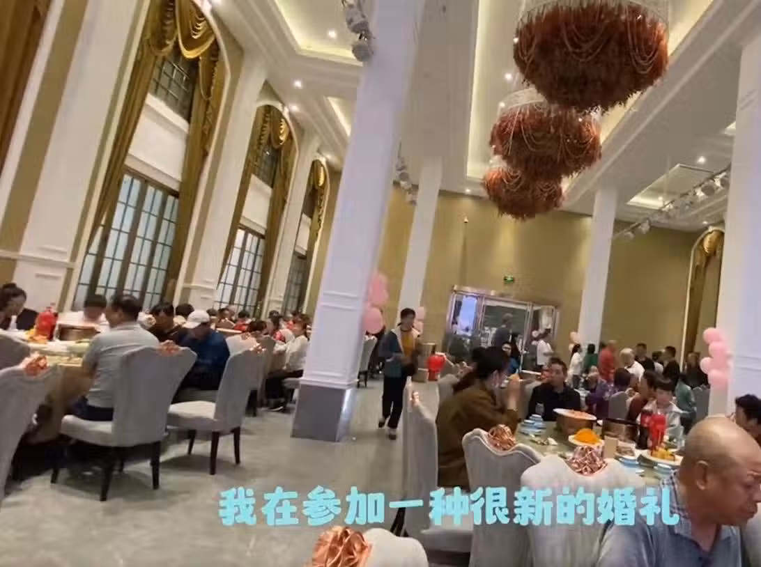 根據中媒《星視頻》報導,河南省焦作市一位田姓女網友去參加鄰居家女兒的婚禮,到了會場才知道新人缺席,現場播放兩人的婚紗照,再由新娘爸媽上台致詞20秒,請客人們好好飯喝酒就光速開席。田女的爸媽也找別桌客人喝酒聊天,她自己則是飽餐一頓,把婚禮影片上傳網路,驚奇表示第一次參加這種「很新的婚禮」。