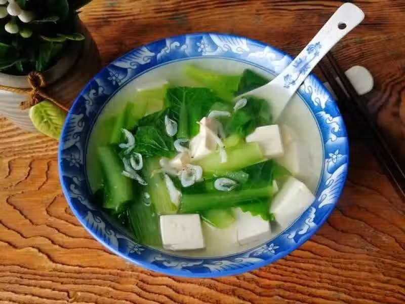 材料:豆腐1塊、蝦皮1湯匙、油菜4棵、香油1湯匙、鹽適量、姜2片、