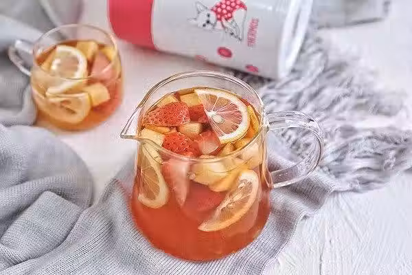 4,把水果都放入燜燒罐內,放入紅茶包,倒入開水,蓋上蓋子燜15分鐘。