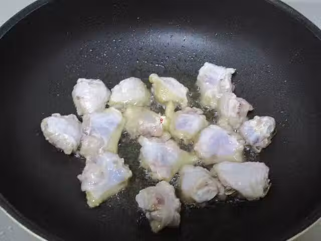 4、再把雞中翅加入後用小火煎熟透後轉大火煎至兩面金黃撈起,一定要先用小火煎熟透後轉大火煎香脆。
