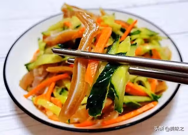 7、豬耳晾涼切絲胡蘿蔔和黃瓜都切成絲放入容器。