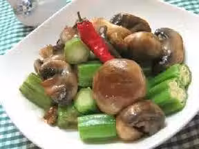 2、熱鍋下油,再放入姜茸蒜茸,半焦後倒下秋葵和蘑菇,稍翻幾下放鹽,攪拌均勻放入勾玻璃芡(玉米粉、雞精、白鬍椒麵)。