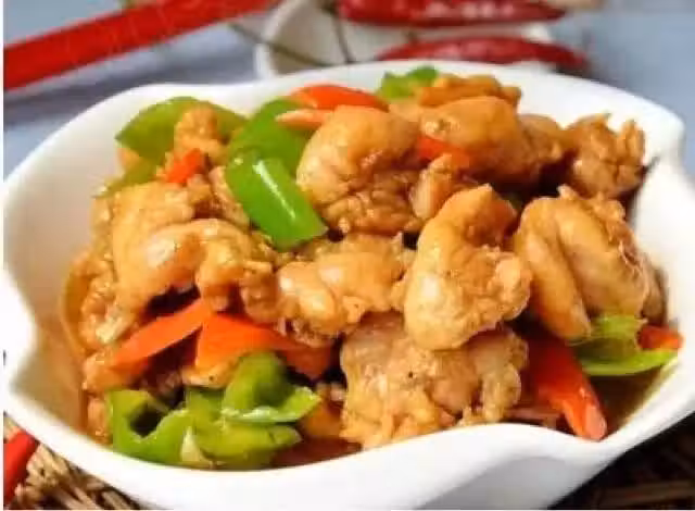 5、倒雞肉翻炒,加醬油、白糖、加青紅椒塊翻炒;