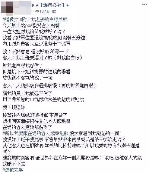 「就是被某些企業寵壞的啊~都認為花錢我最大。在她前面來的、等待餐點的都不是人的概念」、