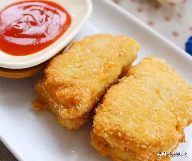 9、炸好的雞塊裝盤,配上番茄醬上桌。
