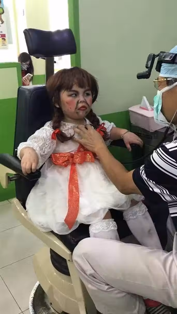 給我小心點!萌弟「萬聖節扮安娜貝爾」來不及卸妝 急忙赴診「近看眼神超哀怨」:敢打針就跟你拚
