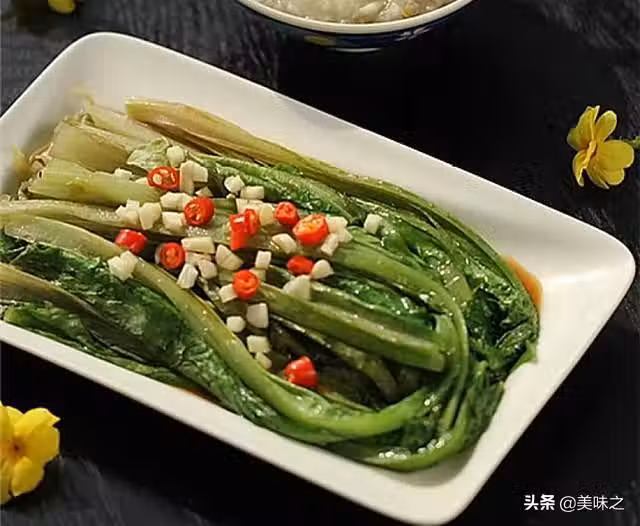 4、油麥菜焯煮變色後馬上撈出來瀝干水分,將準備好的調味料倒入上面;