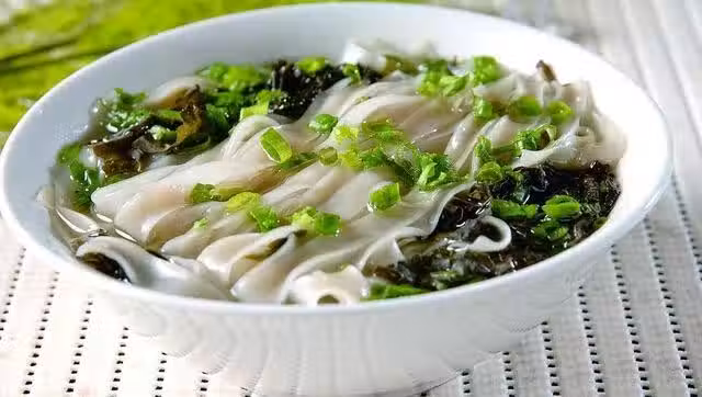 5、麵條煮至9分熟時,下入芝麻葉,再煮至全熟時出鍋盛碗。