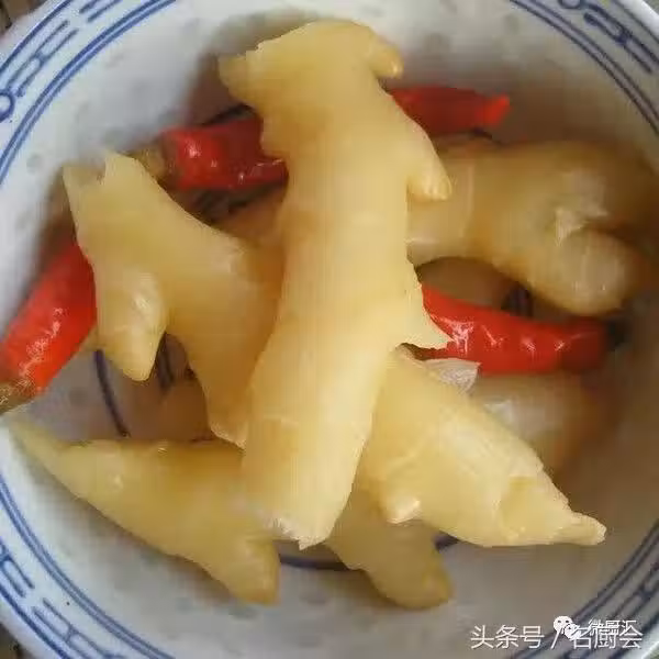 將嫩薑去皮洗凈晾乾,裝入泡菜壇內;把涼開水和鹽化開加入壇內,蓋好蓋,在壇口聽水槽里加滿涼水,10天後即成。