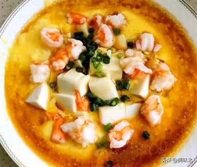3、鍋里燒開水,入鍋蒸8分鐘取出,淋上生抽和香油,撒上蔥花,蝦仁蒸豆腐就做好了。