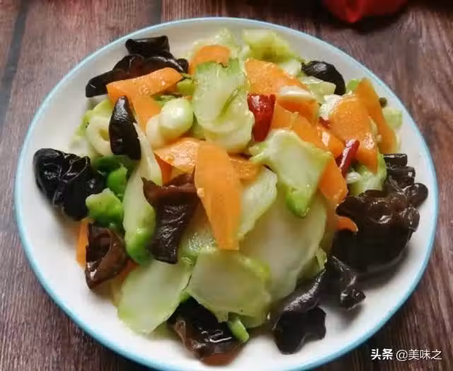 6、黑木耳和胡蘿蔔片放入,翻炒幾下,倒入一勺開水。
