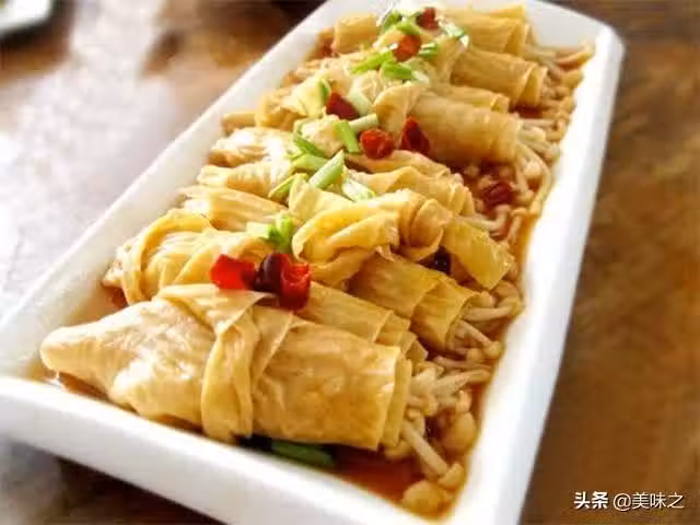 7、看金針菇軟化,豆皮飽吸湯汁,收下汁,盛盤後撒上蒜苗或者蔥花。