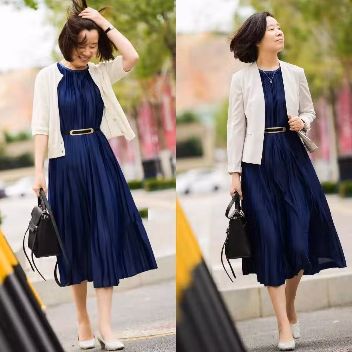 上衣疊穿是比較高階段的玩法,可以幫助我們擺脫單調乏味的感覺。比如我們挑選了一件開衫或者西裝的時候,就可以疊穿收腰連衣裙,實用又時髦。