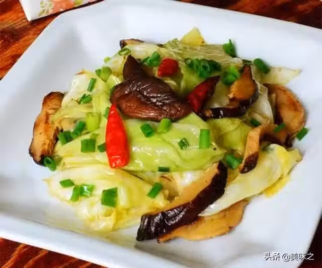 包菜250克、香菇5朵、油適量、鹽適量、料酒適量、蔥適量、姜適量、蒜適量、辣椒適量。