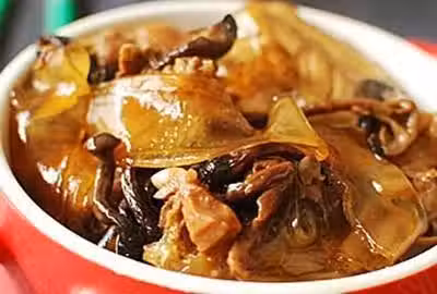 小雞燉蘑菇是一道東北燉菜。通常是用干蘑菇、雞肉和粉條一同燉制而成。榛蘑可以襯托出雞肉的鮮香,粉條滑爽而綿實。小雞燉蘑菇雞肉鮮嫩,營養價值也很高。
