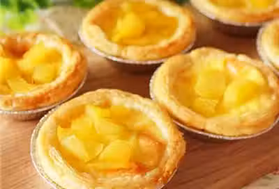 將蛋撻皮擺放在烤盤內,黃桃丁放入蛋撻皮內,倒入蛋撻水,七分滿即可;