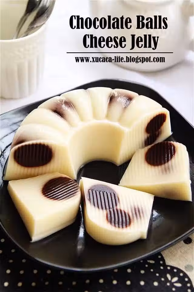 3) 把少許的芝司燕菜水倒入模型里,等稍微凝了,才把做法巧克力球放入,然後倒入剩餘的芝司燕菜。