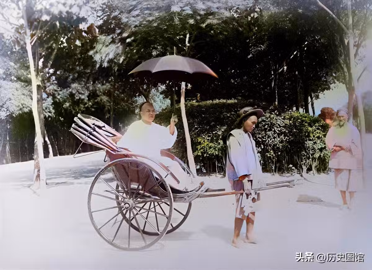 炎炎夏日,一輛黃包車上,坐著一名撐傘的男子。黃包車這種交通工具,在當時的北京街頭非常普遍。人力車夫將乘客送到目的地,就能獲得一定的報酬,足以養家餬口。照片拍攝於1898年。