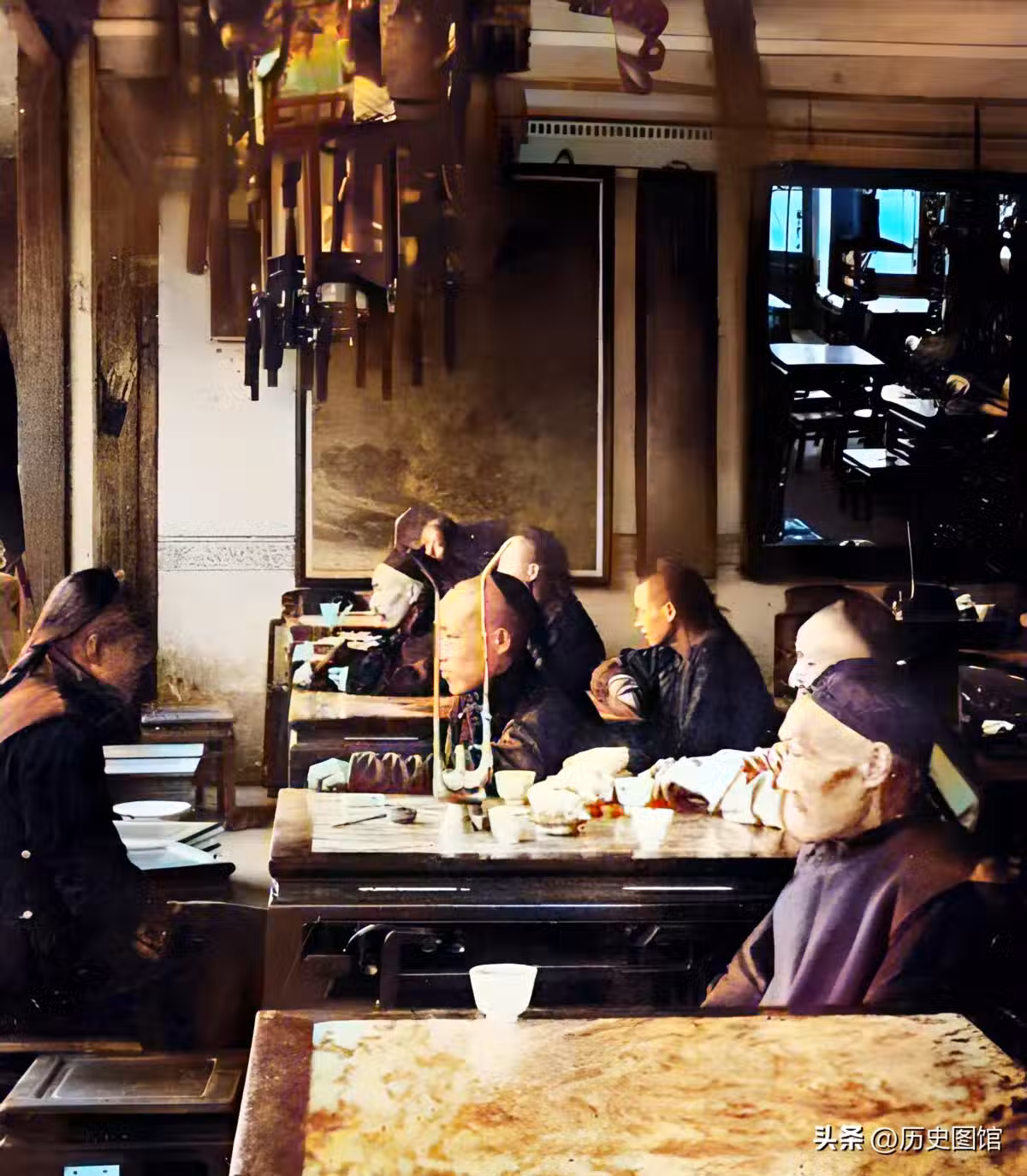 清朝末年,在北京一間茶館裡,人們正坐在桌前,一邊欣賞評說藝人的表演,一邊品茗,桌上擺著瓜子和糖果,好不愜意。清朝茶館娛樂性極強,茶館和戲園子也體現了北京人精緻的生活。