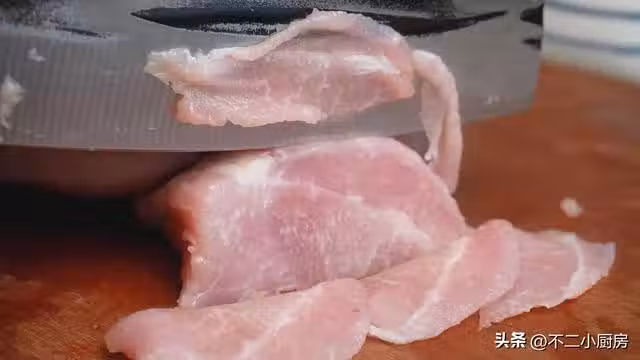 1、首先準備一塊豬瘦肉,有條件的也可以用豬裡脊來做,把肉切成薄一點的片,厚度掌握在兩毫米左右,這樣的肉質比較滑嫩且容易成熟,切好之後放放入到碗中。