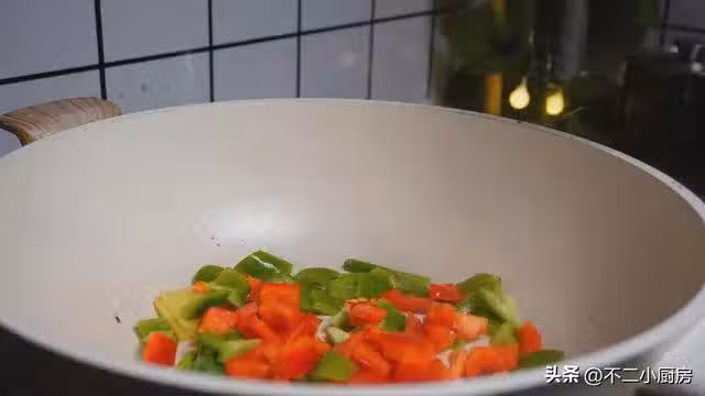 7、鍋中留入少許的底油,下入蔥和姜小火給。它煸炒一下,把蔥姜的香味給它煸炒出來,接著把青紅椒加進來,用鏟子快速的煸炒一下,經過油的煸炒,青紅椒的口感才更加的好吃。