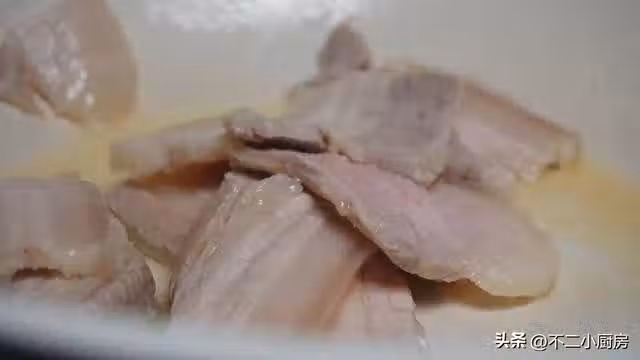 4、起鍋燒油,下入我們切好的五花肉,給它快速煸炒一下。這裡的火一定不要調的太大,小火才能把五花肉中的油脂給它煸炒出來,這樣吃起來才不會膩。
