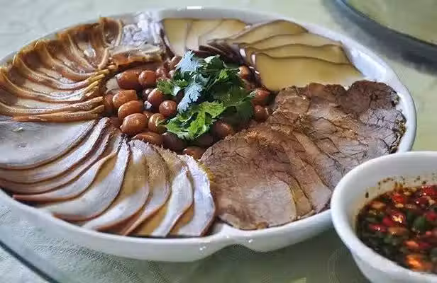 這道「六六大順」的滷味拼盤也是過年的時候人們用於表示美好祝願的吉祥菜。由六種吉祥食材做成:豆腐、干豆腐、鵪鶉蛋、金錢肚、豬耳朵、筍。