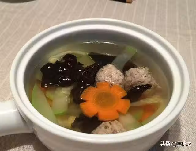 5、將鍋中的水去掉,再重新盛入清水煮沸,加入備好的黑木耳、瓜片、胡蘿蔔片及肉丸,煮4分鐘左右,調入適量鹽後即可出鍋。