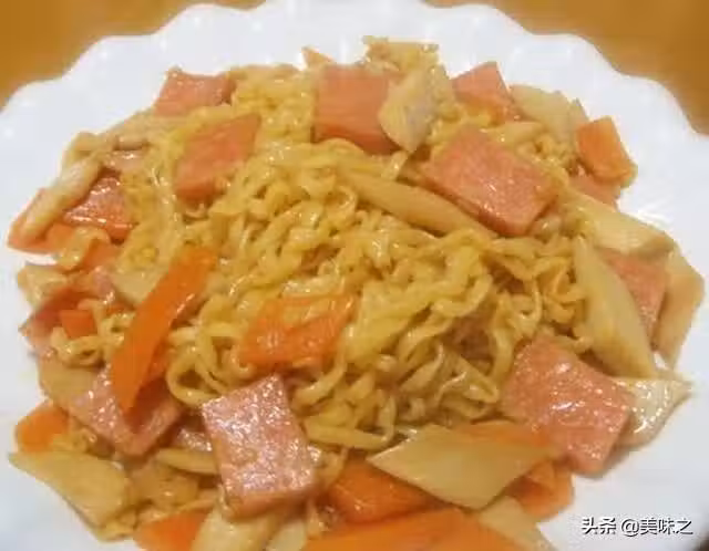 方便麵1包、三文火腿80克、杏鮑菇1個、胡蘿蔔50克、花生油20克、鹽1克、蔥適量、姜適量、蒜適量、調味醬油5克、胡椒粉1克、味精1克、香油適量。