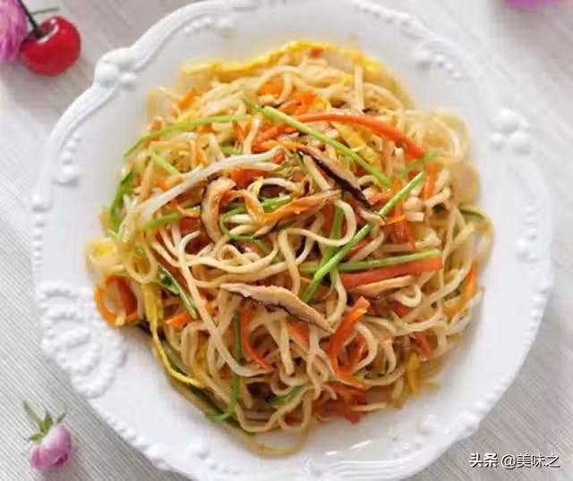 10、放入麵條翻炒均勻,加入適量鹽和少許糖。