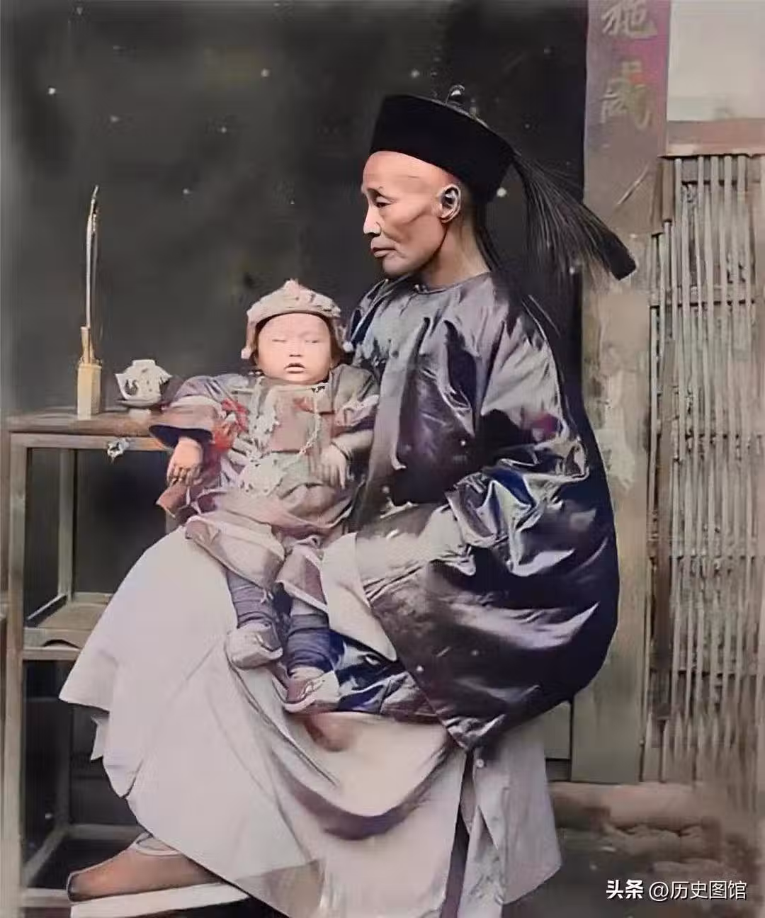 照片中這名男子,是當時的一名官員。他懷裡抱著的是自己的孩子。面對攝影師的鏡頭,他選擇了側身,讓睡著了的孩子正面對著鏡頭。在清朝以往的照片中,這樣的拍攝角度是不常見的。