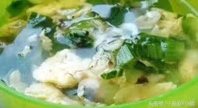 3、待湯再次燒開,緩緩下入蛋液,攪成蛋花,放入油菜。轉小火煮1-2分鐘,放入蔥花,出鍋前加鹽調味,淋香油即可。
