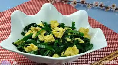 3、把韭菜放進去大火炒,加鹽炒到八分熟的樣子。加入雞蛋,再炒一下,就可以起鍋了。