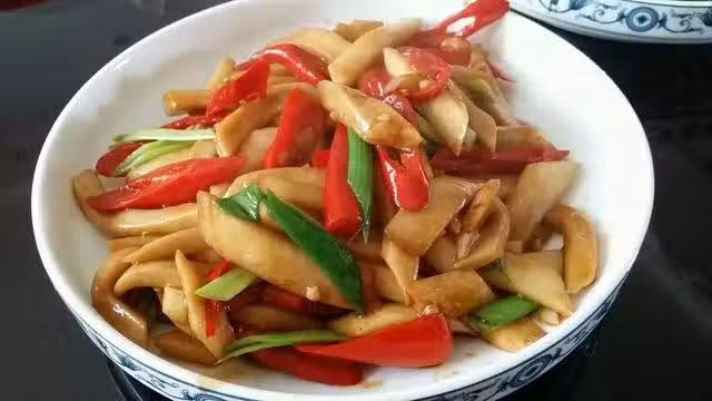 食材:杏鮑菇、紅椒、大蒜、醬油、油、青椒、生薑、耗油、冰糖