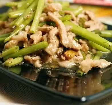食材:空心菜梗,裡脊肉,蒜片少許,料酒,生粉,生抽,鹽。