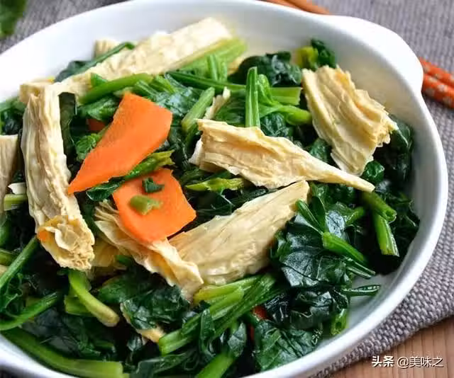 7、清爽解膩又營養的菠菜腐竹就做好了。