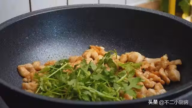 7、接著撒入香菜段給它翻炒一下,這裡一定要把火調的大一些,把香菜的香味給它炒拌出來,翻炒上1~2分鐘就可以了,接著給它裝入到盤鍾,這個時候香味已經散發出來了,顏色也非常的漂亮。