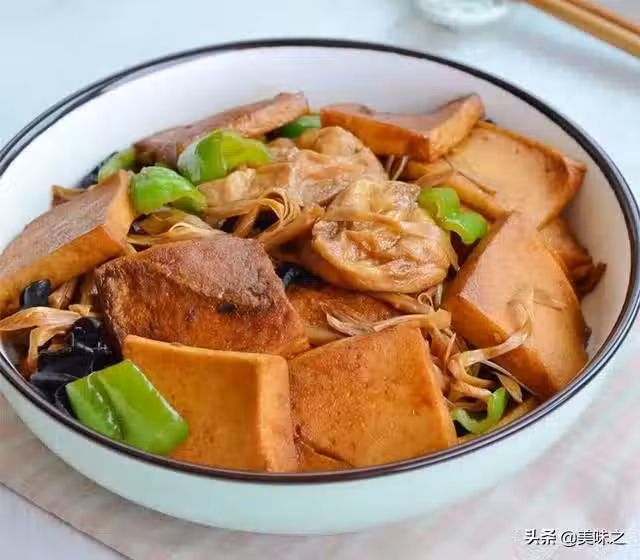 千夜豆腐1盒、干黑木耳10克、黃花菜15克、油麵筋6隻、蚝油2勺、糖1勺。