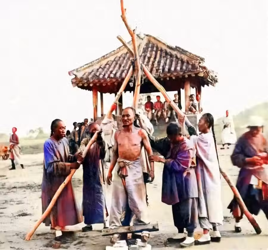 清朝時期,一名土匪被執行凌遲全過程。幾名劊子手將他綁在木架子上,在生命的最後時刻,這名土匪表現得很平靜。遠處的亭子下,坐著一些看熱鬧的人。