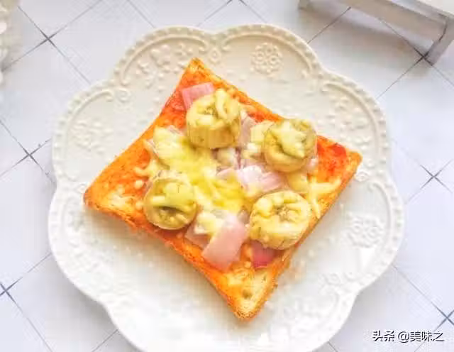 吐司2片、馬格里拉芝士碎20g、番茄醬2匙、玉米粒適量、洋蔥1/2個、蘋果1/2個、香蕉1/2個、金鑼火腿丁1根。