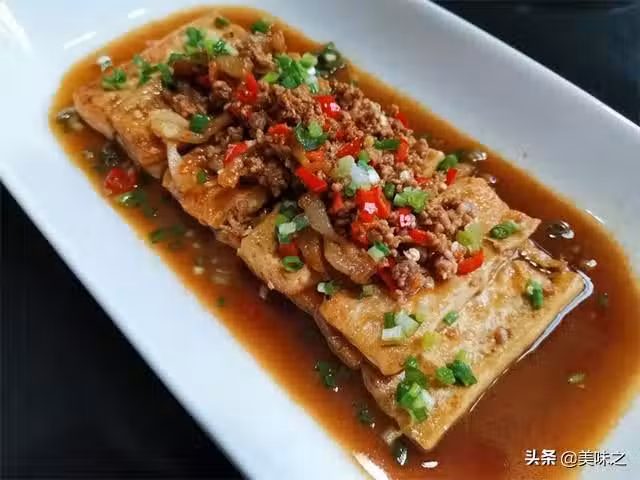豆腐2塊、豬腿肉50g、紅辣椒2個、香蔥1顆、植物油5g、鹽3g、生抽適量、老抽少許。