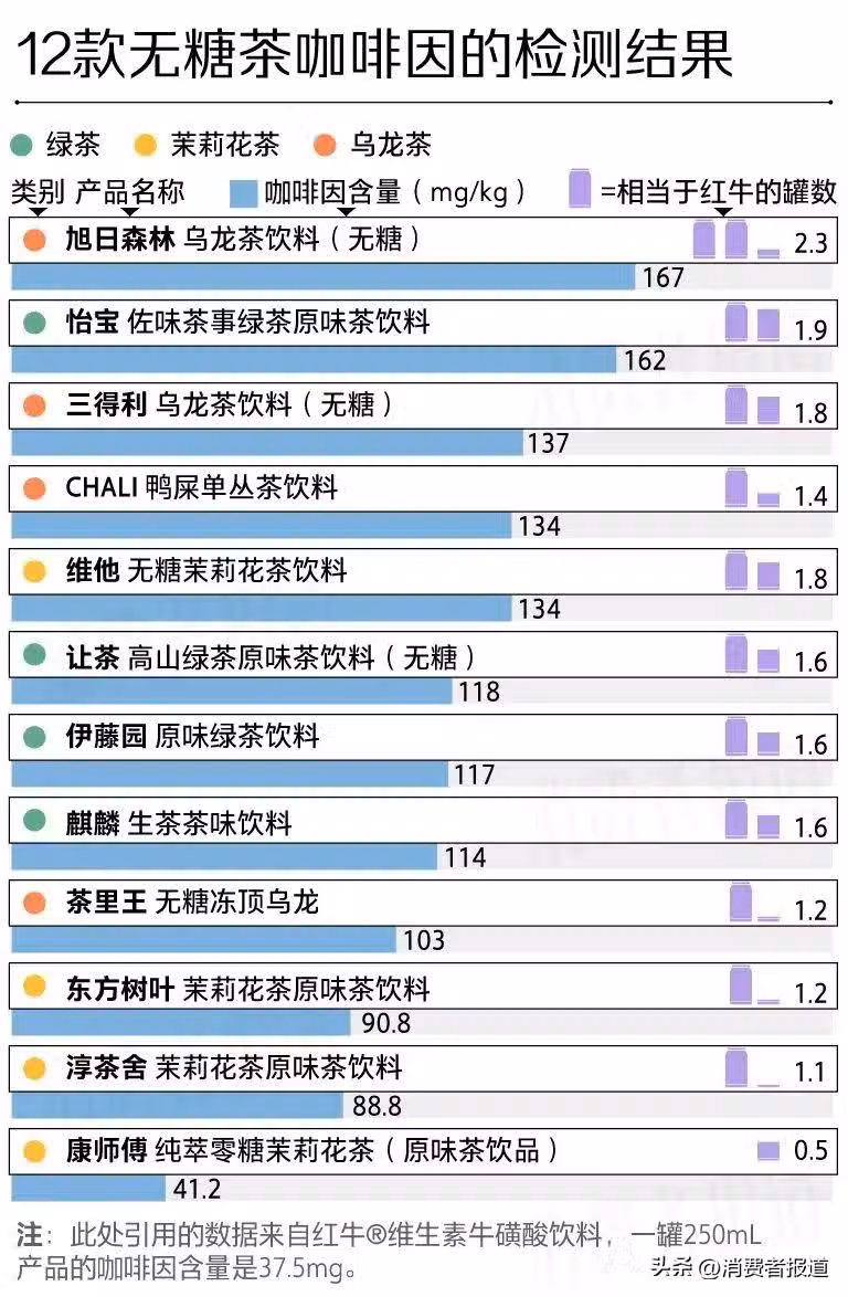 不過,茶飲料中的咖啡因亦不容小覷。若參考紅牛®維生素牛磺酸飲料,一罐250mL的咖啡因含量是37.5mg,普遍相當於此次測評的1.5瓶茶飲料。其中旭日森林的咖啡因含量約等於2.3罐紅牛、怡寶的咖啡因含量約等於1.9罐紅牛。