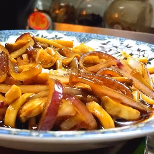 鍋底放油燒熱,把蔥頭絲和杏鮑菇絲同時放入鍋裡翻炒