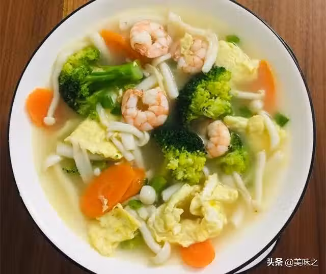 蝦12隻、西蘭花5朵、紅蘿蔔1節、雞蛋1個、海鮮菇1把、蔥適量、鹽適量、油適量。