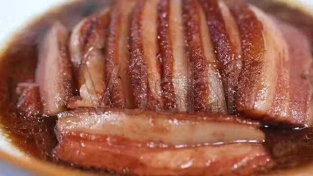 豬軟肋肉從茶湯中撈出洗凈切成厚片,再放入鍋中略炸,切後,放入盤中加入黃酒,老抽醬油,糖,大火隔水蒸1小時,出鍋即可。