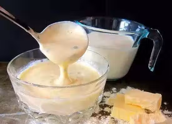 配料: 牛油100g、麵粉250g、鮮奶(奶油)500ml、湯底1.5 litres、鹽-胡椒粉little、香葉pc