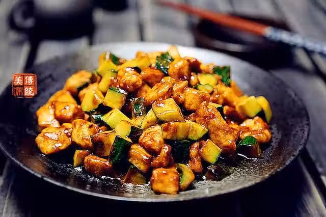第四步:將鍋燒熱,然後倒入適量的食用油,再將雞丁放入鍋中滑炒,炒至顏色變白時控油盛出備用。
