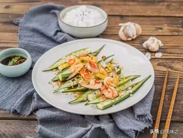 4、秋葵擺在盤底,蝦仁置於秋葵之上。
